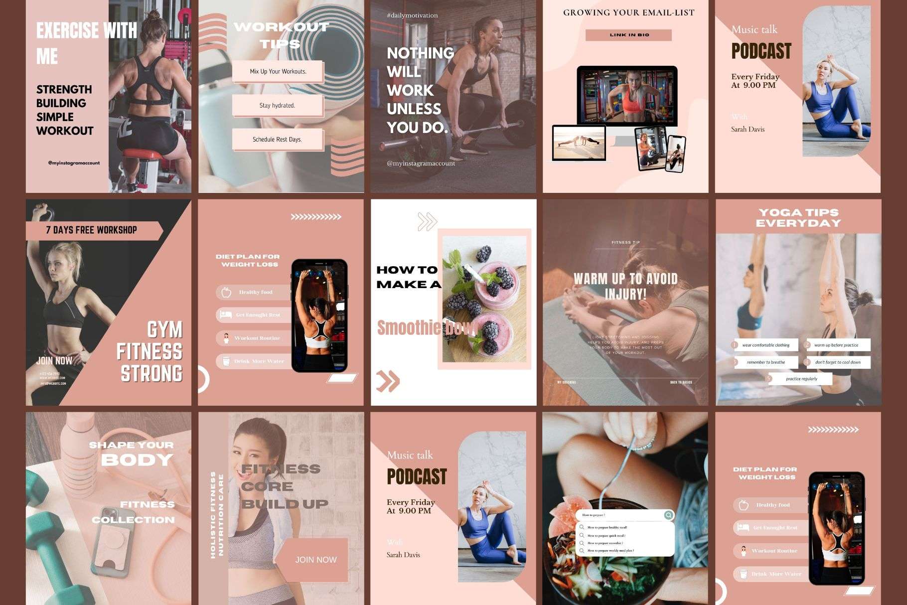 GYM Instagram Templates Fitness with 85 Instagram posts with 85 portrait style templates and 57 story templates for highly engaging social media, fully customizable in Canva with a cohesive look that perfectly matches your brand.