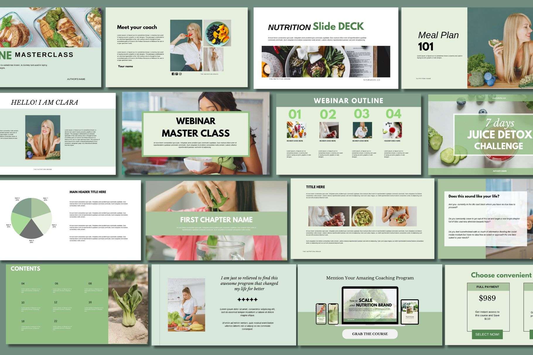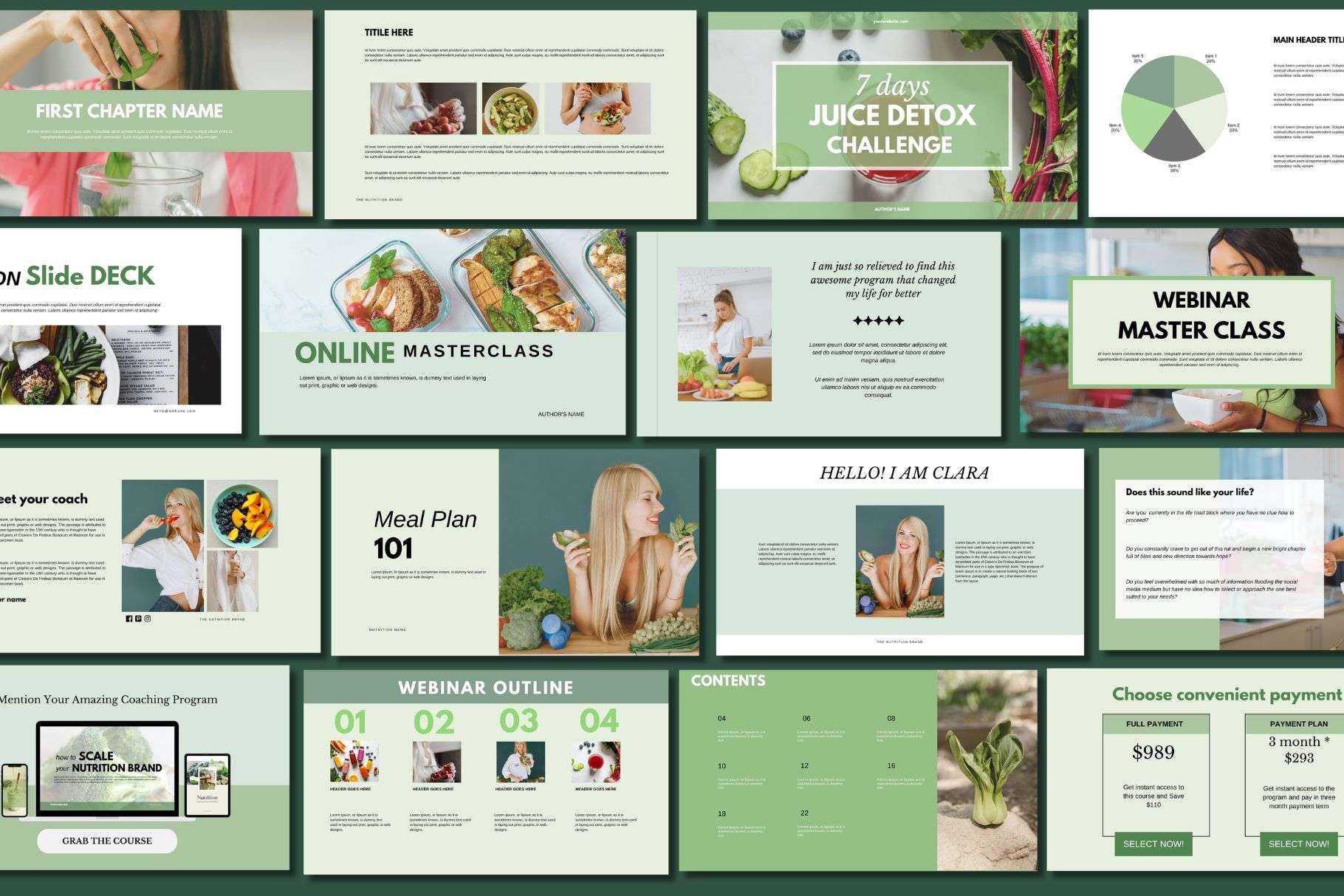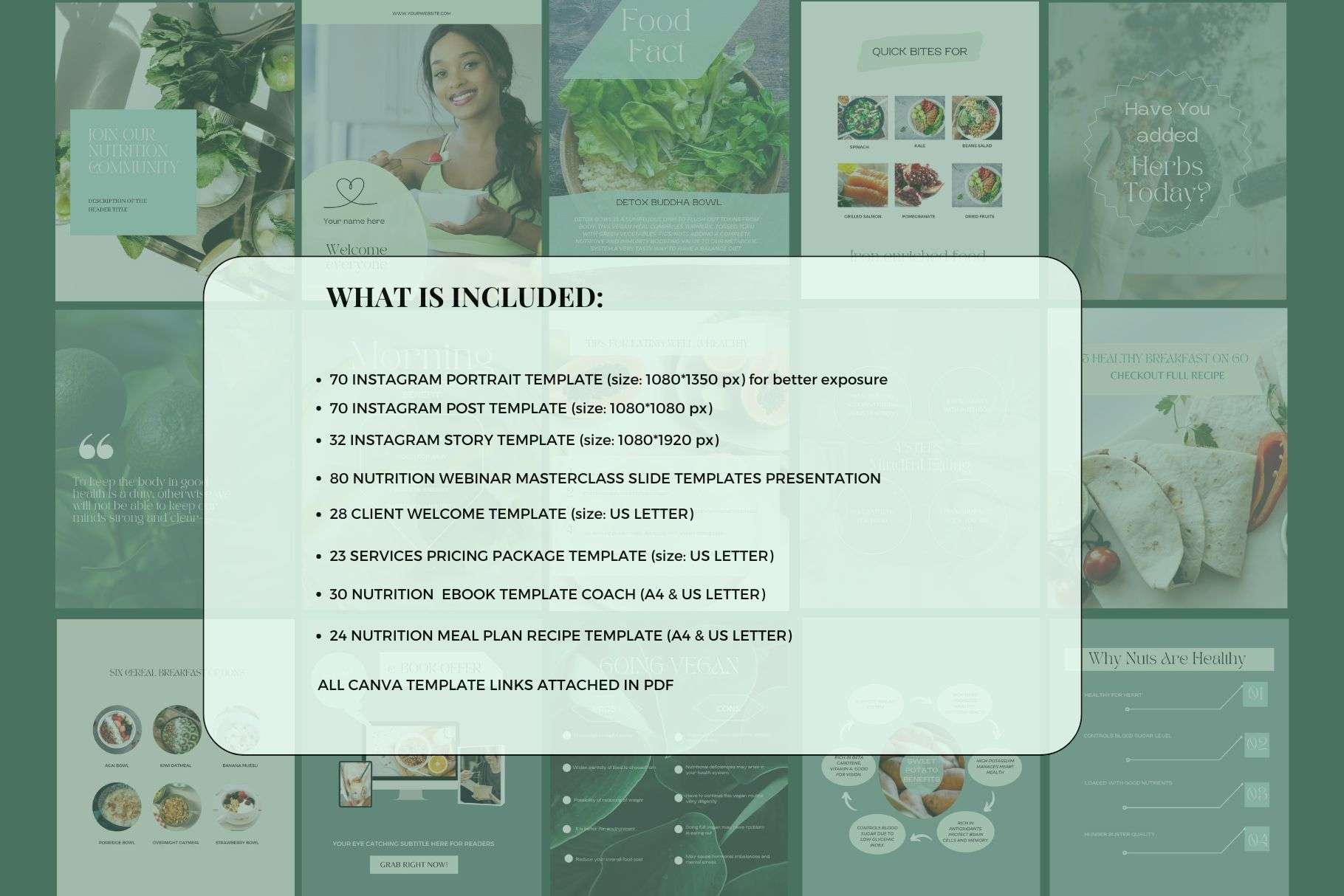 This consists of the Instagram post, IG PORTRAIT posts, Instagram story, WEBINAR slide deck presentation, nutrition ebooks, meal plan recipe ebook, client welcome, services& pricing guide, and BONUS: logo template.